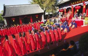 “今年的祭孔活动很多地方与历年有所不同。”据工作人员介绍,今年的祭品一改每年的三牲祭祀,祭品用直径1.5米的生日蛋糕,以呈现现代祭孔的特点。记者在大典现场了解到,今年的祭孔大典还适逢文昌阁暨国学大讲堂工程竣工,文昌帝君像也揭开神秘面纱,正式落户长春文庙。由各地传统文化爱好者捐赠的大型孔子圣迹图碑刻,工程历经3年之久,也以壮观的场面颁上圣墙,精彩再现先师教育风范。此外,今年的祭孔表演,在保持着每年的大型仿古祭孔乐舞的基础上,还为观众献上一台精彩的大型筝乐和汉服筝舞。活动现场,长春文庙还免费向参礼群众发送传统蒙学读物《弟子规》及新儒学儿童读物《海叔的礼物》。(记者 齐晟博)