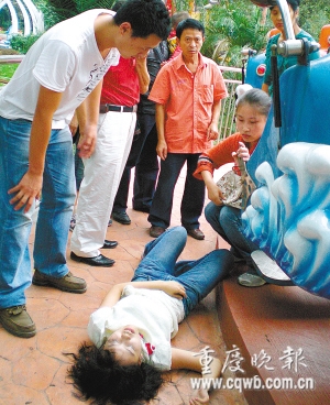 “有人坠地了!”周围响起叫喊声。卡在保险杠和座位之间,身子悬在半空的凌泽坤这才发现,李凤躺在游艺机旁边的地上。游艺机经过一圈减速后,很快停下来。凌泽坤赶到李凤身边,只听见李凤说声“头痛”就昏过去。动物园管理人员和伤者家属一起把伤者送到九龙坡区第一人民医院接受治疗。