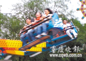 今年国庆假期,在渝工作的凌泽坤和余方明把各自父母从四川隆昌接到重庆。9月29日下午,凌泽坤和父母、同事以及余方明一家共8人,来到市动物园游乐场,准备体验一把“极速变变变”。家长们留下帮忙拍照。4个年轻人坐上游艺机,游艺机启动后,先水平方向转了一圈,然后开始升降交替。