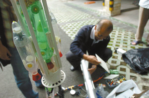 昨日,石才俊老人正在组装他发明的空气压缩火箭。记者 陈浮 摄
