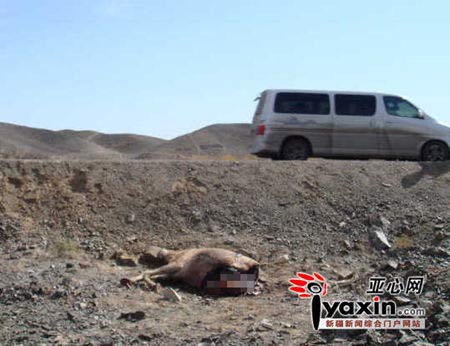 在人们欢庆十一之即,卡拉麦里保护区内一只国家一级保护动物野驴惨死于216国道边,它被车撞死后,又被人的砍去后半身,肠胃留出体外,群蝇围绕,惨状让人不忍目睹。
