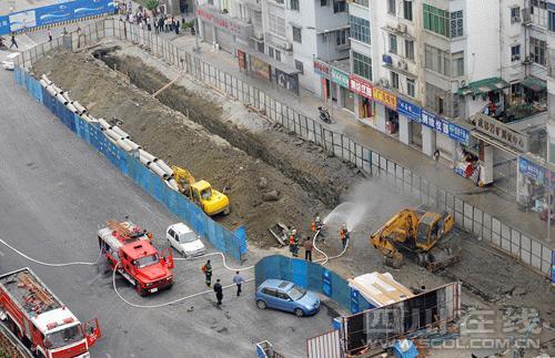 记者看到,消防队员一边疏散围观群众,一边组织水枪手不停地向煤气管道的断裂处、距离出事地最近的成都岩矿测试中心临街的宿舍进行喷射,稀释泄漏出来的煤气。由于施工地点是在快车道上,现场执勤的交警对人民北路一环路口至成都岩矿测试中心段暂时实行交通管制。