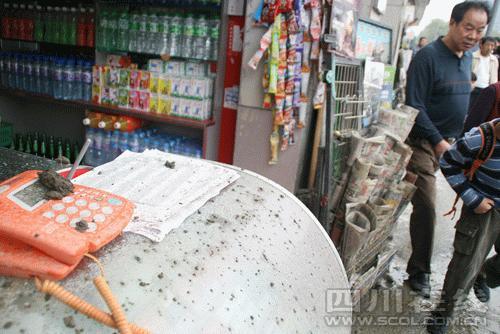 记者在现场看到,人民北路一段25号外,路面全湿,泥浆满地。离出事现场最近的成都岩矿测试中心临街的宿舍,1-6楼墙体污渍斑斑。距离被挖爆管道只有两米距离的成伟干杂店,门口还没有卖完的报纸上全是泥浆,玻璃橱窗上污渍斑斑,大小石块、泥土到处都是。
