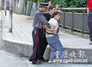 江海涛大叫一声“你吓不到我”,一把抓住白衣男子持刀的右手,与其搏斗起来。约两分钟后,两个同事赶来,和江海涛一起将白衣男子制服。
