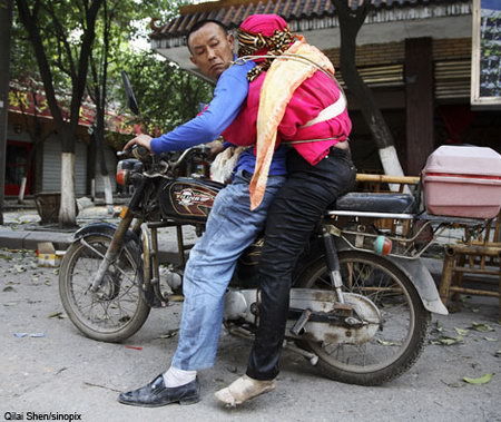 妻子虽在地震中去世,但丈夫为了还妻子一个尊严,毅然将妻子绑在身上,用摩托车载回了家。这幅地震后瞬间抓拍的照片,曾感动了万千网友。昨日,建川博物馆副馆长何新勇赶到绵竹市新龙镇广平村,从吴家方手中接过了他搭载遇难妻子遗体的摩托车。