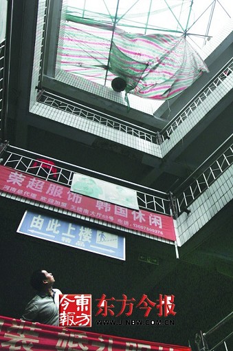 在棚顶最南边还悬挂着一块用来接掉落油漆的5平方米大的彩条塑料布。批发市场的保安小胡说,出事时,他正巧在4楼巡逻,看到男孩先是掉落到塑料布上,然后又掉到了下面。