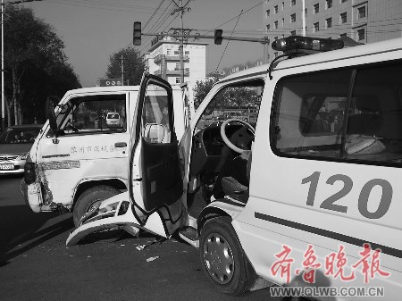 “120”闯红灯撞上小货车 无人员伤亡(图)