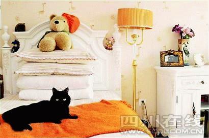 粉红壁纸、成套白色欧式单人床、床头柜、落地灯……床头一张大头照中的黑色猫咪,是这间屋的主人。猫主人专门将一间闲置的客卧打扫出来,用作“女儿”的“闺房”。被子枕头用不上,但是一两条名牌的毛毯是必备的。床上的玩具是猫主人去香港迪斯尼玩时带回来的驼色小乌龟。
