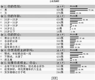 接受调查的人当中,52.4%的人年龄在20岁—25岁之间,其中男性占77.0%。调查中,赞成“icefreezing”辞职,认为年轻就该闯一闯的占54.4%,人数过半。36.6%的人则选择“不赞成,太傻了。”余下的人则没主意。