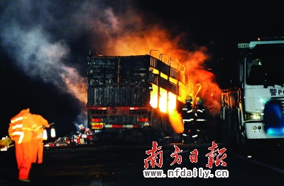 昨日凌晨零点18分,在京珠高速清远段高岗往鱼湾方向,一辆大货车追尾一辆装有40多吨柴油的油罐车,油罐车立即起火,40余吨柴油顺着高速路排水沟流淌约一公里,并剧烈燃烧约4小时。