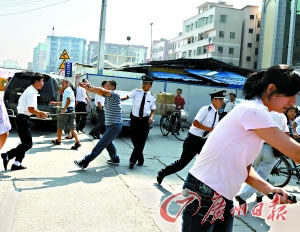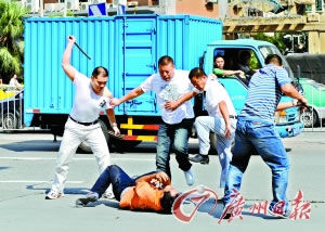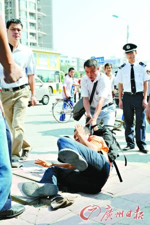 广州日报10月18日报道 昨天上午10时,广州市中山大道,四个壮汉当街殴打一名《广州青年报》的送报员,两名白色衣服的保安自始至终在一边旁观。后来,有市民上前劝说阻挡,并协助警察将其中两名犯罪嫌疑人抓获。