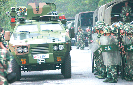 图为武警装甲作战车将警力运送到瓦窑岭村附近 李君光摄