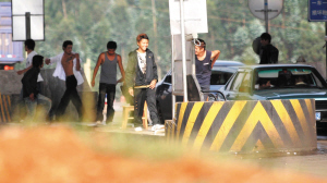 16日下午2点,记者来到丫普龙收费站。通过的车辆很少,6个收费道口只开放4个。红白相间的收费亭里,坐着几名身着工作服的收费员。每个收费匝道口都横着一根涂有反光涂料的栏杆,几个身着各式T恤、衬衫的年轻小伙坐在匝道旁。他们身旁摆放着几根木棍,大约1米长,其中一人的坐椅下还摆放着一根钢管。