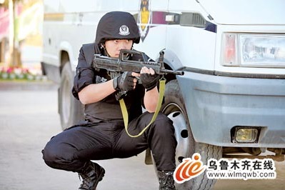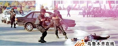 高速公路上,一辆黑色轿车突然冲过交警卡点,警笛响起,头戴钢盔、手持微型冲锋枪的特勤民警快速出击,嫌疑人向民警开枪时被“击毙”……10月21日,新疆高等级公路交警支队进行了建队十年来,规模最大的一次快速应对高速路突发事件演习。
