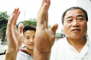 陈文锦伸出右手,记者看到,他手掌大约6厘米厚,有一般人两三倍厚,摸上去硬梆梆,关节处都是厚厚一层老茧。