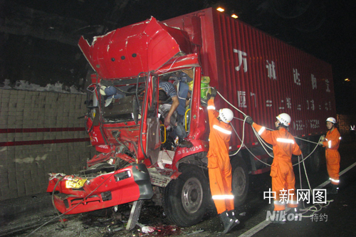 据了解,现场由于两车撞击,福建籍牌照货车车头严重变形,整个驾驶室被撞扁,玻璃全部撞碎,卡在驾驶室里的一名男子当场死亡,另一名躺在驾驶室后面的男子也已经死亡。救援人员对变形车辆进行查看后,迅速展开营救,先利用液压扩张器对变形车门进行扩张,随后再将车头固定实施牵引拉开变形车头,将卡在车内两名男子拉出,在液压扩张器与牵引装置的配合营救下,8时10分左右,两名男子被救出,随后高速交警迅速对现场进行处理,堵塞1个多小时的道路才得以通行。