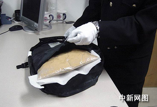 旅检现场关员从双肩背包的夹层里发现了1253克的毒品海洛因。
