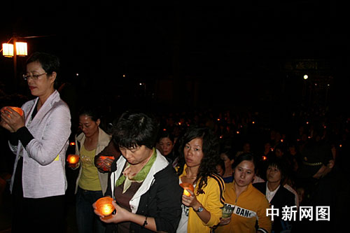 中新网舟山10月28日电(记者 江耘) 十月二十八日晚,著名的佛教圣地浙江普陀山普济寺里,海峡两岸的几千名游客、信众手捧明灯慢慢行走。第六届中国普陀山观音文化节的传灯祈愿法会正在举行。
