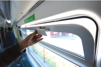 4号线列车内部最特别的地方是车窗。普通列车车窗是全封闭的,但4号线列车每个车窗的上弦窗都可开启。乘客只需抬起上弦窗部开关,上弦窗便可自外而内向上开启30度。这样既满足了乘客对车内通风的紧急需求,也保证车窗打开后列车安全运行。