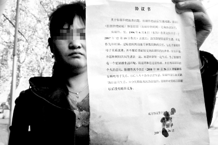 因为这份协议不合法,郑州市公证处不予公证。为了让协议具有效力,刘红和王丽在签字上面按上指印。按上指印后,王丽突然咬着嘴唇,泪珠大颗大颗掉了下来。她匆匆在一张协议上按了指印后,死活也不愿在另外两张上面按了,并开始大骂她的丈夫王涛。门外围了一圈邻居。大家七嘴八舌劝道:“何必这样呢,两家人商量个办法,一块来照顾孩子。不管怎样,要为孩子想想。”王涛把其他人往店外推:“没事没事,放心吧,她现在不按,回头我会劝她。”