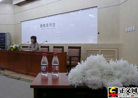 新闻发布会现场摆放着寄托哀思的白菊花