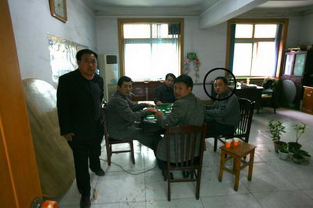 由于采访需要,记者来到南柏舍镇派出所。该派出所与镇政府同在一个大院。在二楼,正当记者寻找户籍科时,在西走廊第一个房间内,看到四名男子正在“哗哗”地洗着麻将牌,旁边还有一名男子在旁观。