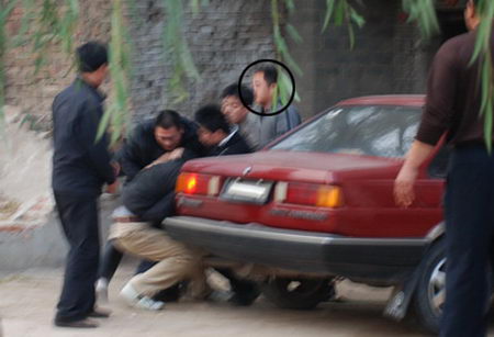 在这几名男子的追打下,3名记者和司机退到了南柏舍镇政府。追打者追到镇政府门口后,依然不肯罢休,在门口不停地叫骂。