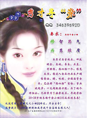 昨日,记者在杨家坪杨馨酒店外的广告宣传栏上看到这则由A4纸打印的征婚广告,上面还有一张古典装扮的美女图。广告上写到:“本秀才五官端正,四肢健全,真诚,善良,正直,有理想……目前有形资产6位数,无形资产9位数,未来的亿万富翁,慈善家……寻找芳龄20~30岁,电视连续剧《上海滩》里冯程程类型的未婚千金小姐101名共创未来!(1名共创家庭,100名共创事业)”广告上,除了一个QQ号码外,没有留下其他任何联系方式。