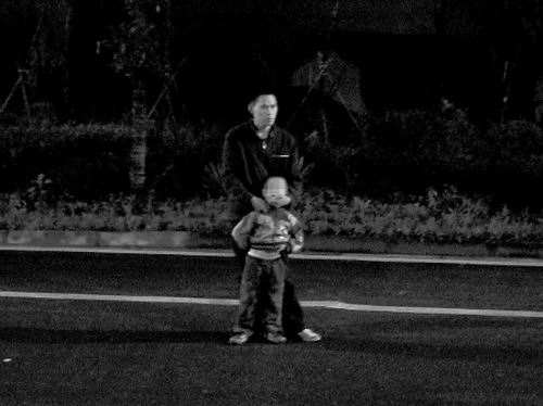 一名中等身材、瘦削的男子站在公平街办建安社区5组路口对面的龙新路快车道上,身前紧挨着站着一名小男孩。据称,小男孩就是持刀男子的亲生儿子、5岁的小明(化名)。男子右手紧握一把20多厘米长的尖刀,刀刃紧贴着小明的脖子,不时在快车道上来回走动,还左右张望,十分警惕。一名戴眼镜男子站在持刀男子对面三四米外,正在与当地派出所民警苦口婆心地劝说男子放开劫持的小男孩。戴眼镜男子是持刀男子的大哥。