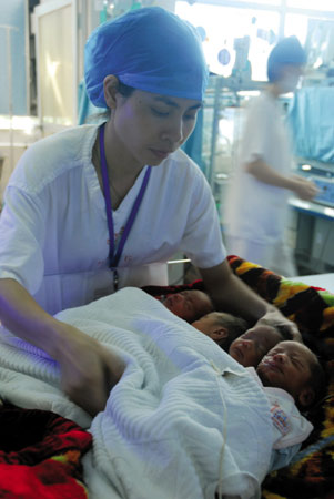 尽管孩子的父亲失踪,孩子们在医院得到很好的照顾。记者采访时看到四胞胎躺在婴儿温箱里睡得很香。医务人员告诉记者,四胞胎属于早产儿,住院前四胞胎中的男婴肺部出了点问题,吸过几天氧,现在情况已基本稳定,另外三名女婴的健康状况都比较好。
