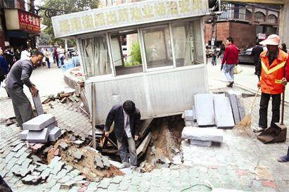 附近一酒店厨师辛辉告诉记者,上午8时40分左右,岗亭靠近马路一侧出现约两平方米的坍塌,接着中部出现空洞,几分钟之后,后半部又出现塌陷。由于地陷并非瞬间完成,所以没有路人受伤。