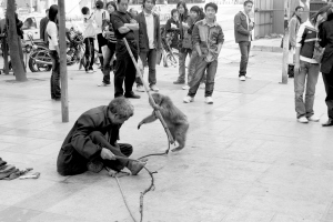 耍猴人的一名同伴立即上前制止,过了两分钟,耍猴人才从地上爬了起来。同伴称,耍猴的老翁姓吕,今年63岁。5年前,吕师傅在河南南阳一座山上撒网捉到了这两只猕猴,训练一年之后,他将猴子带到重庆,四处耍猴赚钱。