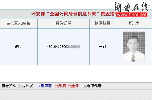 不少网友根据已有信息开展“人肉搜索”,据网友“追寻者”提供的信息显示,该男子系岳阳市人大代表,69年出生,名叫曹阳。一名网友更利用公安部新近开通的“全国公民身份信息系统”将曹姓男子的身份证照片搜索出来并贴到网上。还有山东枣庄的网友提供了嫌疑男子的手机号码及详细住址,网友半信半疑,有网友更是试图拨打号码,但无法接通。