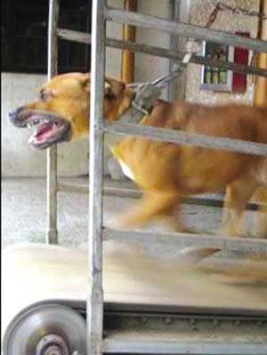 一条狗被拴在石磨推杆的架子上,它的前方挂着一笼子,为了追到笼子里的鸽子,狗不停地推着石磨绕圈跑,但它永远追不到;跑步机上,同样拴着一条狗,吐着舌头,不停地奔跑……前天,一位游客在奉化民国大杂院旅游时,看到斗狗场的训狗人员用这种方式训练狗,以此来锻炼狗的肌肉。这位游客认为,这属于虐狗行为,应当制止。