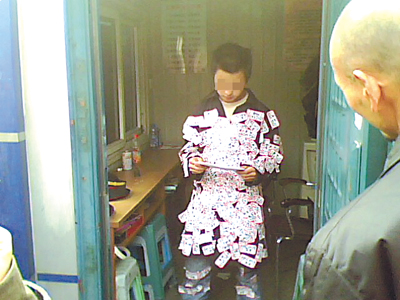 昨日上午,记者在大渝网大渝吧看到,网友“十五阿哥”在名为《如此惩罚,该当何罪?》帖中贴出3张照片,一名十余岁的男孩站在市政监察亭里,全身贴满“办证”字样的标签。男孩垂着头,面无表情,双手还捏着一张纸。在第三张照片中,醒目的“市政监察”四个大字下,挤满了看热闹的群众。网友“十五阿哥”在帖中称,这些小孩儿受人指使,满街贴办证广告,确实让人厌恶。但是工作人员将他们浑身贴满标签当街示众,这种惩罚的方式让人质疑。