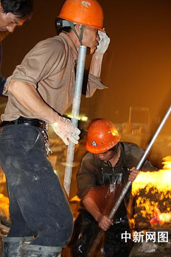 熟悉现场情况的工人正在寻找可能存活的工友。作者:张兆岭