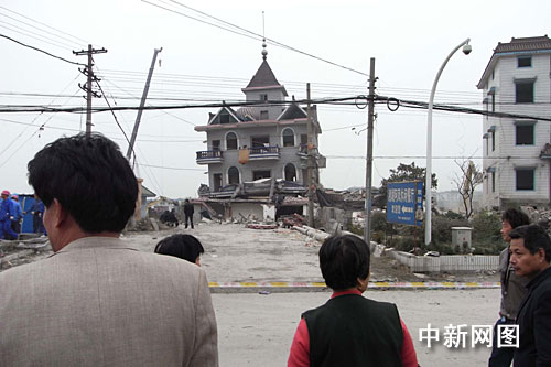 中新网杭州11月17日电(记者 龚读法 实习生 姜越潮 王磊)11月17日上午,位于地铁坍塌事故现场,基坑东侧的四幢民房已经开始进行拆除。