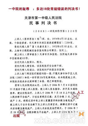 一篇名为《天津某法院多达18处低级错误的终审判决书》出现在某论坛上。一位网名是“哭泣不是懦弱”的发帖人在帖子中写道:“这是我2008年11月7日领到的法院终审判决书。一份仅6页的判决书,光错别字、丢字等低级错误就有18处。这样一份错误百出的终审民事判决书还赫然盖上了"××法院"的公章。难道法官就是这样的工作态度吗?法律的权威与神圣荡然无存!”