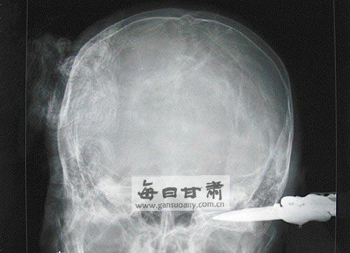 拍片显示水果刀插在后脑处。本报记者李桐叶摄