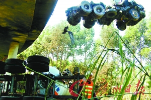 在罐内液化气燃烧殆尽后,车体总重量还有20多吨,且车头、拖车和气罐分离,将气罐车残骸从十余米的桥底吊上桥面,给施工作业带来很大难度。为了顺利吊起这个“大家伙”,施工方临时给吊车安装了28吨的“镇车钢板”,以增强吊车的稳定性和保险系数。