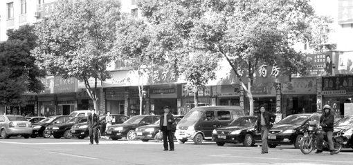 大冶市交通局对面的人行道上停放了十余辆“黑的” (胡新桥摄)