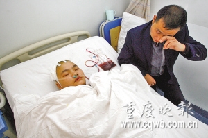 袁正敏头部插着输血软管