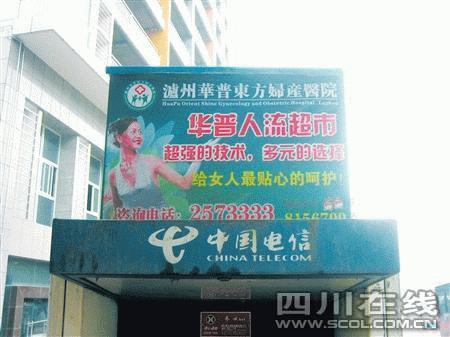 本学期开学以来,一位泸州十五中女生家长多次反映学校附近人行道电话亭上的华普东方医院广告涉嫌违规。“太不像话了,他们居然打出‘ 人流超市’的宣传。是不是说‘人流’就像进商场买东西一样简单嘛?”该家长认为,人工流产是一件对女性身体伤害极大的事情,年轻女性应该尽量避免。医院如此打出人流广告,是暗示人流像在超市购买商品一样简单,对女性尤其是少女健康不利。“他们还把广告打在学校附近,对正处于成长发育期的孩子非常不利。我真担心女儿受到影响!”接到家长反映后,记者在城区连江路十五中附近和前进中路一带发现了这些广告。广告都发布在人行道电话亭顶部,约两平方米大小,除了宣传医院名称、超强技术等内容外,“华普人流超市”作为广告主体内容显得格外显眼。