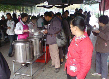 帖子称:“‘施粥摊’的全名叫‘红日亭施粥摊’,那里正排着一条长龙,许多从衣着、年龄和气质上就能看出并不富裕的民众正安静地排队领受免费的大米粥。亭子其实是一顶帐篷,里面有一些桌椅,可供年老体弱的人坐着吃,更多的人坐在外面。那里正好有几棵大树,也成了吃免费粥的人休息的地方。每个领受大米粥的人都可以拿到一副同样免费提供的碗筷,为了卫生的考虑,碗用可以盛食物的塑料袋包裹。在亭子的一角,甚至还有免费的小菜提供;种类有酱瓜、黃豆、榨菜等等,用一个个小碟子盛着,供人自由取用。在那亭子的一侧,有一个‘捐献名单’,表明是一些有善心的民众自发组织起来的爱心点……”