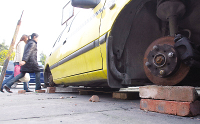 昨天下午2时许,记者在朝天门湖广会馆附近一露天停车看到,该停车场内竟然有10多辆车子没有轮胎,4个轮胎部位垫的是砖头支撑车身。停车场管理员称,这里停放的车辆多为交警部门暂扣的一些违法车辆和“黑车”。为了防盗,停车场管理人员曾想过不少办法,效果不太好。
