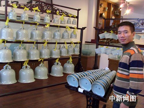 王军港研发烧制首套青瓷乐器的动因非常简单,“古人形容我们龙泉青瓷是‘青如玉、明如镜、声如罄’,前两者我的前辈们都已经做得很出色了,只有这‘声如罄’到底有多美妙呢?我能不能另辟蹊径,从这方面去试试看,做些与众不同的青瓷出来?”这个非同寻常的念头让好动的小伙顿时变得安静,三年来,除了出访,王军港每天守着工作室那一隅净土潜心研究他的青瓷乐器。王军港说别看他烧制了那么多青瓷乐器,但事实上他并不懂音律,为了研究开发青瓷乐器,除了一次次试验,还寻遍全国大大小小的乐器厂拜师学艺,并到福建等地学习原料的配制、烧窑等技术,直到自己能将釉及胎的厚薄等自如掌控为止。