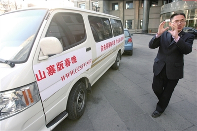 向央视春晚叫板,给全国人民拜年。”昨天,朝阳区华严北里8号院2号楼下,一辆写有挑衅口号的面包车惹得市民驻足观看。这辆“牛车”的车主老孟说,要自办一场草根参加的山寨版春晚,时间与央视春晚同步,通过网络直播。目的就是向央视春晚叫板。