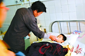 昨天中午12时30分,在汕头市中心医院住院B楼儿科病房17号床前,站着一个中年男子,他叫高贵增。高贵增身穿一件较旧的深色麻布衣服,脚踩一双磨损的蓝色人字拖鞋,乱蓬蓬的头发下是一张挤满皱纹的黑瘦脸庞。他表情木讷地站在不大的病房里,看着病床上躺着的9岁儿子小海(化名),孩子鼻孔里塞着氧气管,在病床上已经躺了6天。