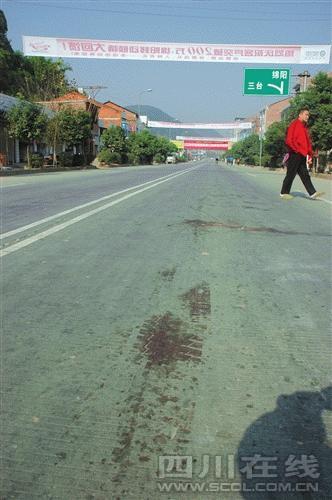 出事地点位于盐亭县两河场镇中部一个路口,是小镇相对热闹的地段,周围店铺也较为集中。尽管过去了10多个小时,路面上一摊凝固的血迹和往来车辆碾压血迹形成的暗红色轮胎印迹仍清晰可见。