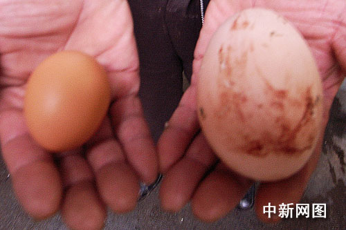 “巨无霸”鸡蛋对比普通鸡蛋。作者:余丽军